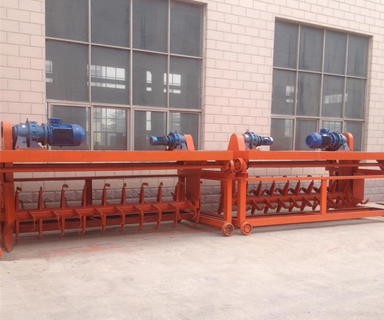 酒糟有機物料制肥翻堆機槽式翻堆機是目前應用得最為廣泛的一種發酵翻拋翻堆設備,它包括行走發酵槽體、行走軌道、取電裝置、翻拋翻堆部分以及轉槽裝置(也叫轉運車,主要是用于多槽使用的情況)。翻拋翻堆工作部分采用先進的滾筒傳動,有可升降式的和不能升降的兩種。可升降式的主要用在槽體幅寬不超過5米,翻拋翻堆深度不超過1.3米的工作情況。。翻堆裝置的軸承座固接于翻堆機架上,兩根主軸固接于軸承座中,每根主軸上焊接有若干按一定距離且交錯一定角度排布的翻堆軸,每個翻堆軸上都焊接有翻堆板。翻堆裝置通過銷軸與行走裝置相連。行走裝置的軸承座固接于行走機架上,裝有行走輪的兩根接軸I固接于軸承座中,每根接軸I的一端通過聯軸器與接軸II的一端相連,減速機II的兩輸出軸分別通過聯軸器與兩根接軸II的另一端相連。起升裝置的電動葫蘆固接于行走機架上,鋼絲繩的一端繞在電動葫蘆上,另一端固定于翻堆機架上。